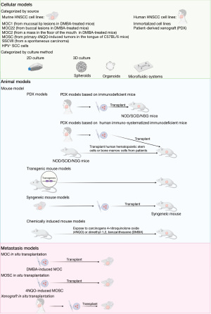 Various preclinical animal models mimicking human tumors have been developed to understand tumorigenesis and progression and to test the efficacy of various therapeutic regimens. Here, we will briefly summarize the HNSCC cell and animal models (Figure 1).
