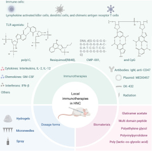 Compared to systemic administration, intratumor injections of immune agents have multiple advantages, including directly delivering drugs to the tumor; increasing the intratumoral drug concentration; stimulating tumor antigen-specific immune responses; reversing immunosuppressive mechanisms in the TME; allowing for the combination of multiple drugs; and reducing systemic drug exposure and associated side effects (16,17). In this review, we summarize the clinical studies related to local immunotherapy for HNSCC, provide a brief summary of preclinical cellular and animal models of HNSCC, and research articles on the local delivery of immunotherapy for HNSCC. We present this article in accordance with the Narrative Review reporting checklist (available at https://fomm.amegroups.com/article/view/10.21037/fomm-25-13/rc).