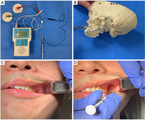 Botox injection for the lateral pterygoid muscle is technically easier. As with the technique for the medial pterygoid muscle there are two approaches and EMG guidance is required. The first and most simple is an intraoral injection immediately behind the maxillary tuberosity. A tongue blade is used to displace the cheek laterally and with the teeth slightly separated and a 30-degree bend of the needle, the needle is directed medially and superiorly behind the tuberosity until the lateral pterygoid plate is encountered (13). Typically 15–25 units of Botox is adequate (Figure 3A-3D).