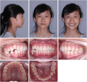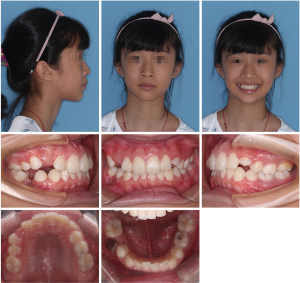 The patient underwent the orthodontic operation at 11 years and 5 months old. The extraoral examination revealed mild facial asymmetry with the chin deviated to the right side. The intraoral examination, showed Class I malocclusion of the patient, with a mild crowding in both arches. The upper midline of the arch deviated to the right side slightly (Figure 2). Panoramic radiographs demonstrated no pathology. Cephalometric analysis revealed a Class II skeletal relationship and a hyperdivergent growth pattern. The lower incisor inclination was reduced.